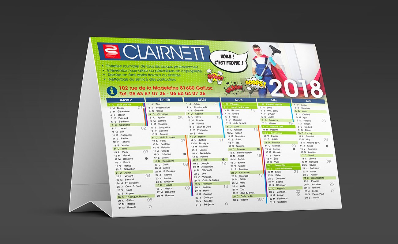 Le format chevalet sélectionné par le client offre un calendrier pratique et fonctionnel, pour ne rien oublier des événements importants, de même que cette société de nettoyage qui reste grâce à ses calendriers, à portée du regard.